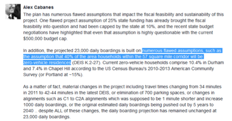 “...These ridership projections are further inflated with the working assumption that 40 percent of households in the Durham-Chapel Hill corridor will not own automobiles in 2040, which flies in the face of current ownership levels and assumes a tectonic shift in public behavior."